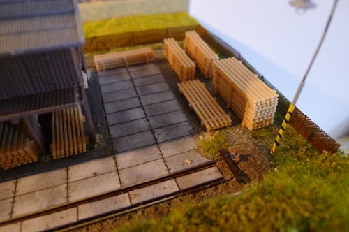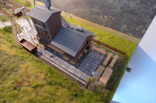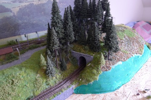 Šturc dostal lehkou patinu razvou barvou, kterou pouřívám na koleje a trocho zeleně do okolí. Hromada štěrku tvořící šturc ještě zaroste křovím.