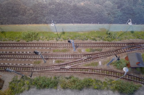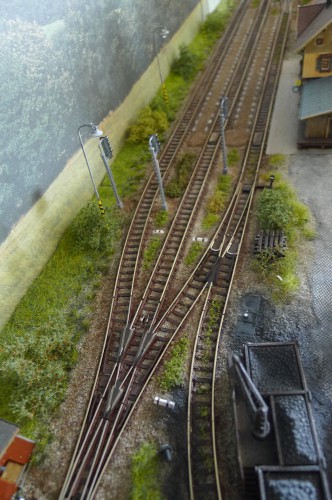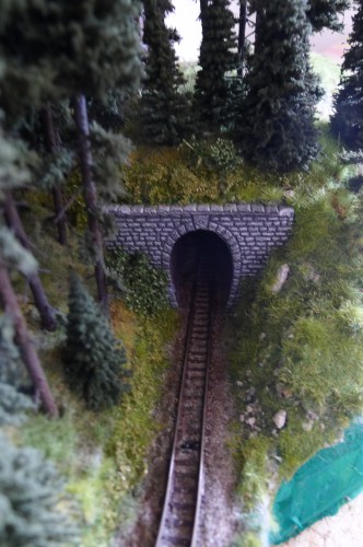 I zde jsem bok kolejiště polepil imitazí zdiva a přístup ke skrytému nádraží natřel černou.